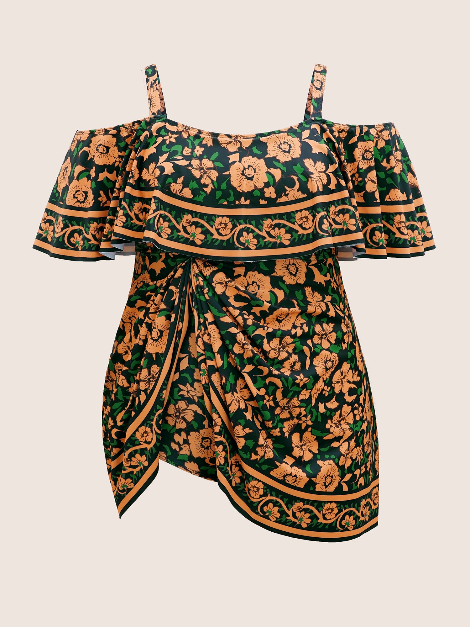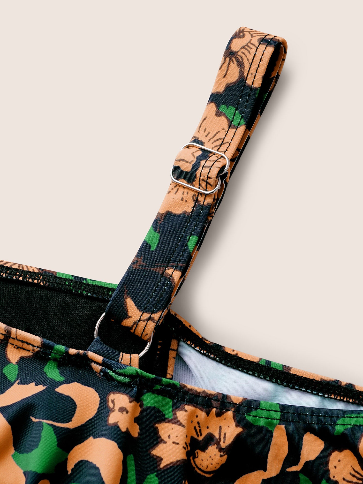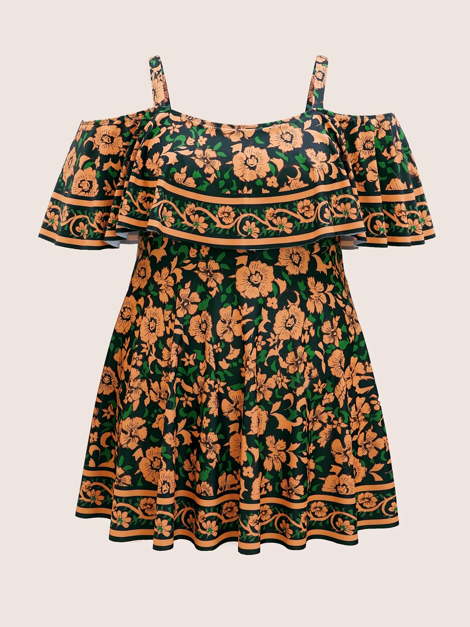 • Floral One Shoulder Neck Ruffles Swim Dress
